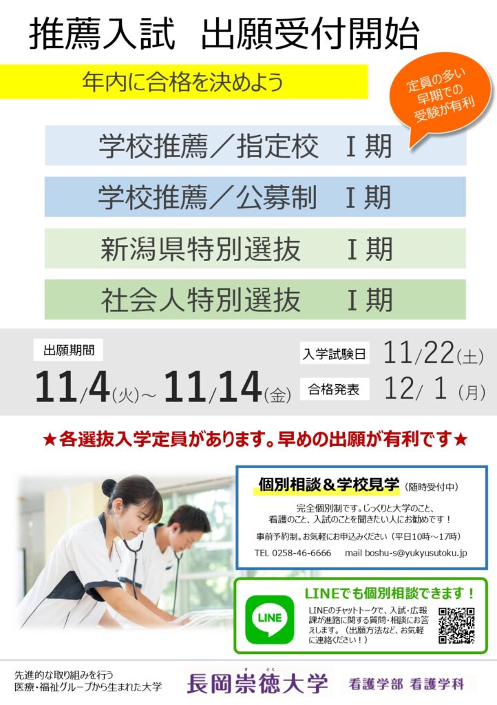 更新日:2025.10.20 入試情報 11/4(火)学校推薦型/新潟県・社会人/第3年次編入出願受付スタート! 2025年11月4日(火)より、学校推薦型選抜、新潟県特別選抜、社会人特別選抜、第3年次編入学試験の出願受付を開始します。出願に関して何かご不明な点等ございましたら、入試・広報課までお問い合わせください。 ●入試要項はこちら●出願についてはこちら●2026年度募集要項はこちら < 第3年次編入学試験について 一覧へ戻る 長岡崇徳大学大学祭「徳樹祭」を開催します! >