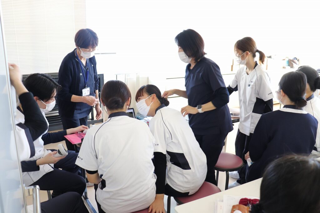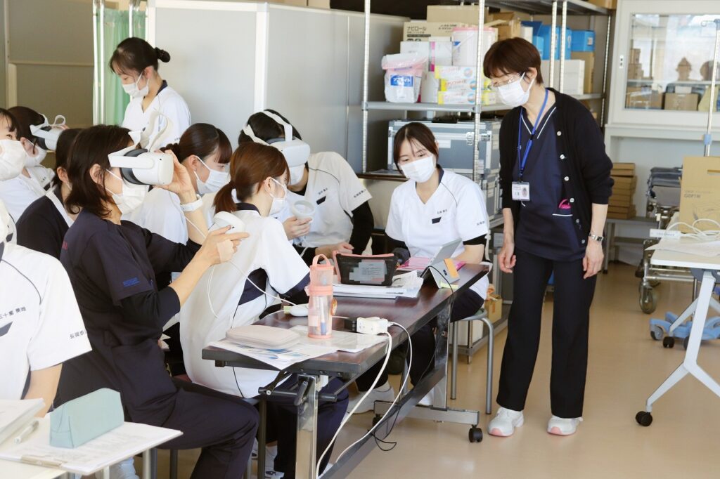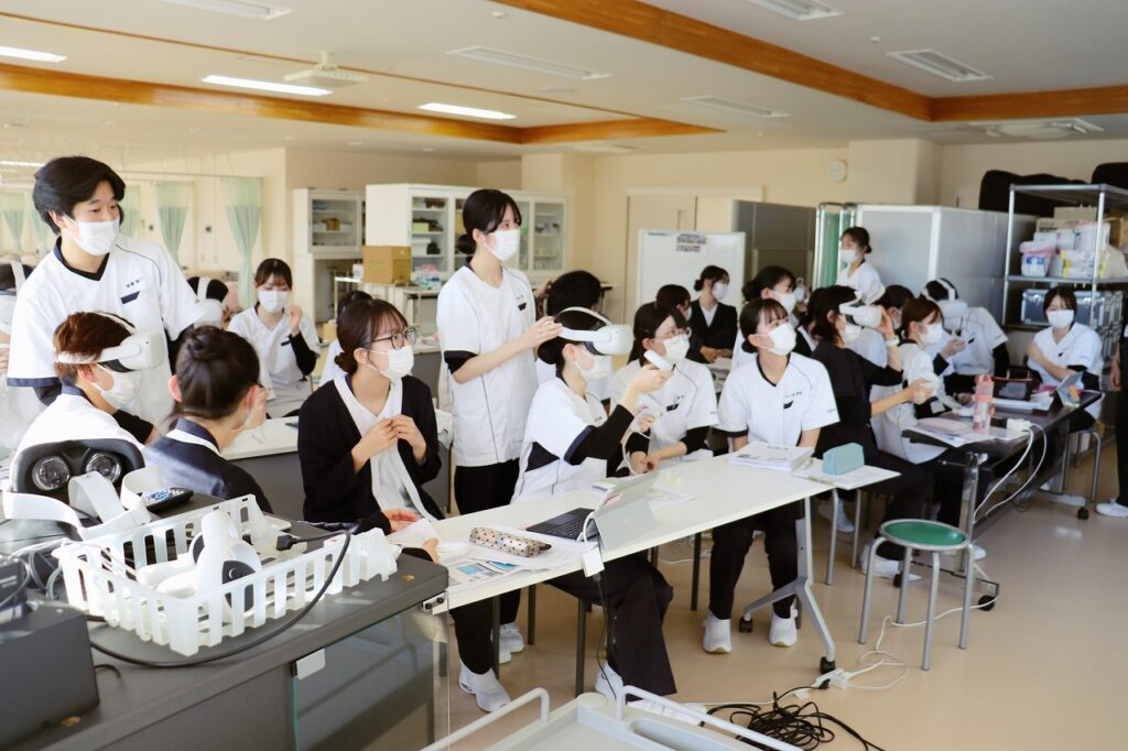 更新日:2025.12.20 お知らせ 基礎看護技術演習Ⅱの授業風景 基礎看護技術演習Ⅱでは看護教材VRを活用し、臨床現場をリアルに再現した仮想空間での演習に取り組んでいます。学生たちは実際の現場にいるかのような臨場感の中で、ワクワク・ドキドキしながら学びを深めています。学内にはVRゴーグルを整備しており、図書館でも自由に利用できる環境を整えています。VR教材には本学教員が撮影・編集を行ったオリジナル教材もあり、今後もVR教材を活用した授業づくりを積極的に進めていきます。 < 年末年始休業のお知らせ 一覧へ戻る 1月学食メニューです! >