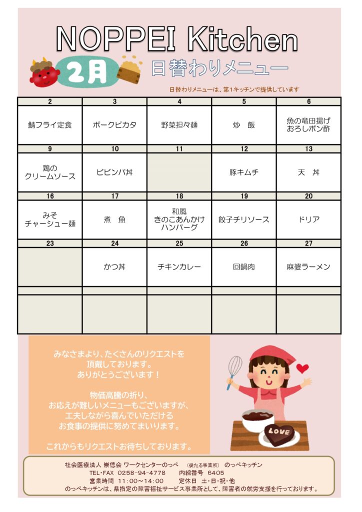 のっぺキッチンの2月メニュー表を公開しました!