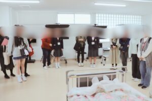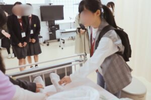 その後は学生スタッフの案内でキャンパスツアーへ!シミュレーション人形の体験や、
