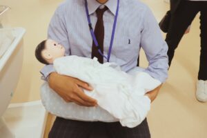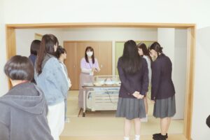 母子看護学実習室で赤ちゃんの抱っこ体験をしていただき、学びの環境を体感していただきました。